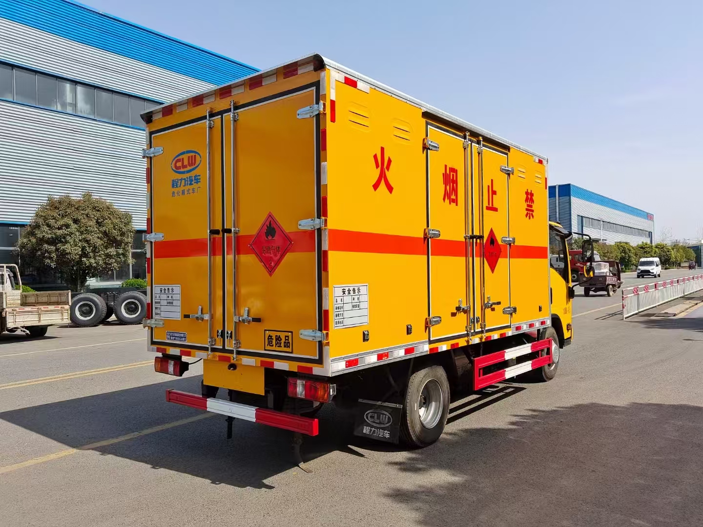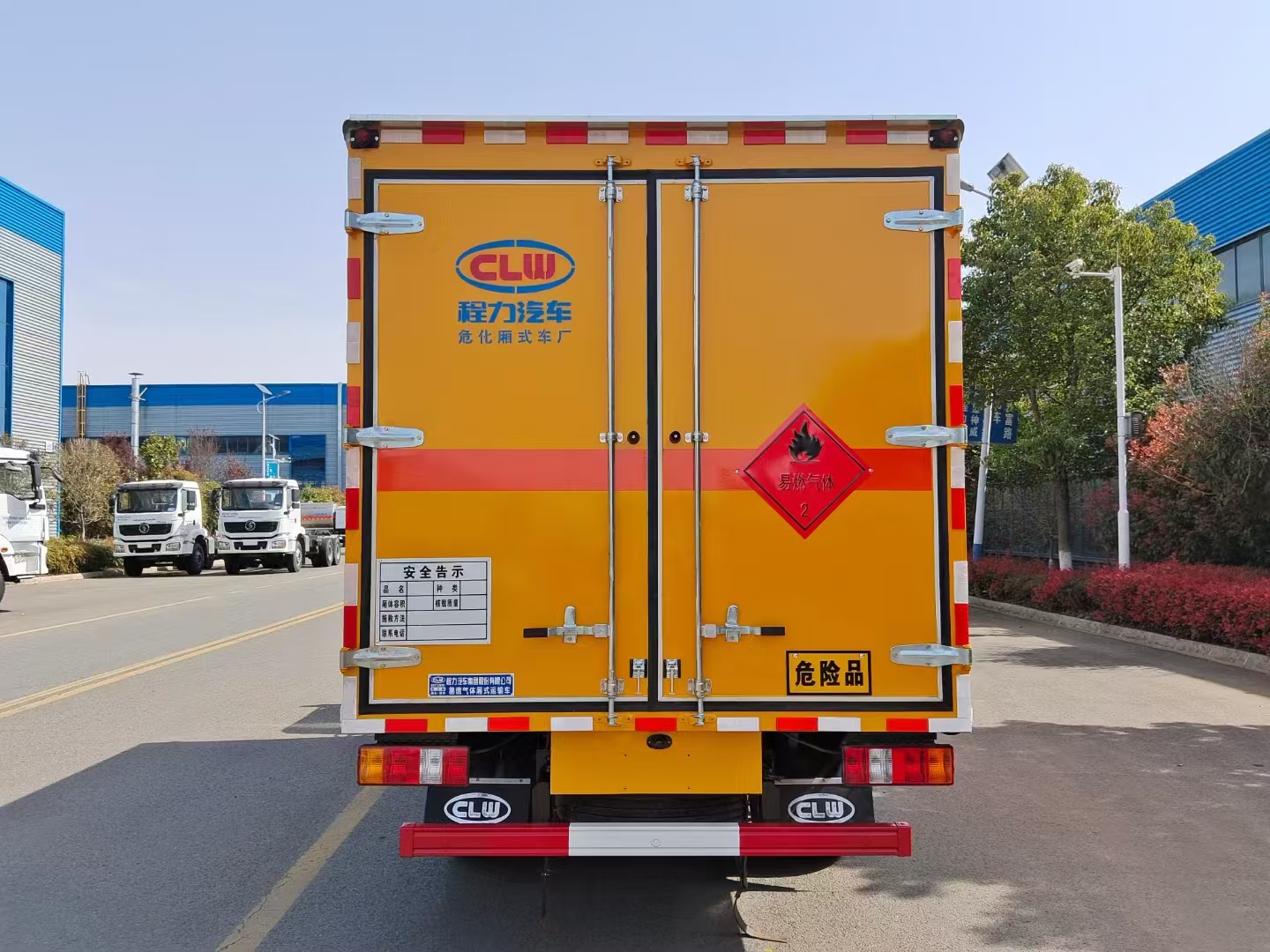 | 貨箱配置 | 廂體為雙層金屬骨架結(jié)構(gòu),外板采用冷軋鋼板,中間填充阻燃泡沫,內(nèi)飾為鋁板。底板為平板上鋪防靜電膠皮。廂內(nèi)兩側(cè)加裝固定貨物臥環(huán),門(mén)框帶防盜報(bào)警器,頂部帶煙霧報(bào)警器,廂體右側(cè)選裝側(cè)門(mén),隨車(chē)配2個(gè)滅火器,危險(xiǎn)標(biāo)志牌,防火帽,危險(xiǎn)品三角頂燈。 (選裝瓦楞板貨箱) (尾部可選裝液壓升降尾板) | ||