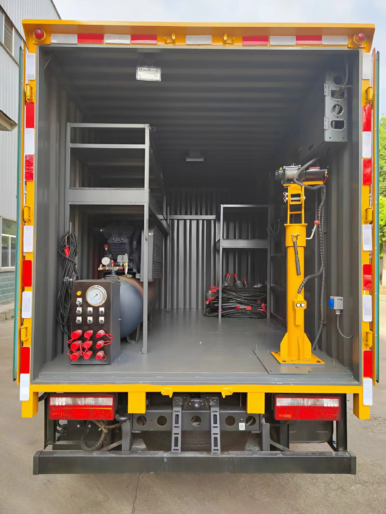 | 上裝配置 | 箱體采用瓦楞箱體,側(cè)面和后面各一個(gè)雙開(kāi)門(mén),箱內(nèi)設(shè)計(jì)兩個(gè)貨架,箱內(nèi)設(shè)計(jì)照明燈,安裝液壓動(dòng)力系統(tǒng),三套液壓動(dòng)力取力快速接口,帶控制面板兩臺(tái)4寸的渣漿泵,帶水帶和液壓管(帶快接)裝一個(gè)液壓驅(qū)動(dòng)空壓機(jī),一個(gè)800公斤12V電控小吊機(jī)安裝3500W逆變器,帶電控箱,其他程力專用車(chē)廠家標(biāo)配… | ||