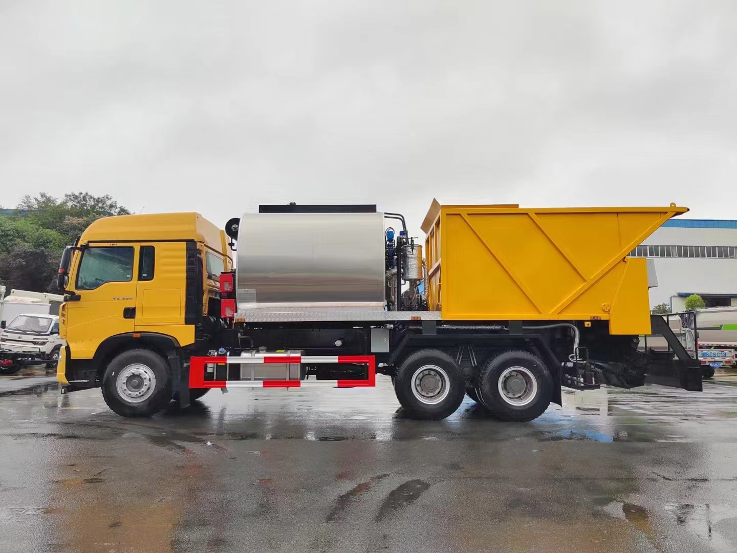 | 設(shè)備優(yōu)點 | 獨家采用全液壓驅(qū)動模式,不需要添加任何輔助動力使操作更加簡單方便。獨家采用高效的導(dǎo)熱油鍋爐升溫,使溫升速度大大的得到提升,打破了傳統(tǒng)的煙道加溫方式。該設(shè)備采用內(nèi)舉升料斗就可實現(xiàn)石屑撒布施工,更方便涵洞施工、橋下施工、以及彎道施工;該設(shè)備完全采用電氣控制,自動化程度高,能精確的計算出設(shè)備在施工過程中瀝青噴灑量和石屑撒布量的多少;料門控制采用角度儀,保證設(shè)備下料的精度;降低了施工的勞動強度,節(jié)約了人力資源,降低施工成本,提高工作效率、工作質(zhì)量;整機運行穩(wěn)定,撒布均勻,可自由調(diào)節(jié)灑瀝青撒料寬度;良好的保溫層確保保溫性能指數(shù)≤20℃/8h,且防腐耐用;可以噴灑各種瀝青介質(zhì),撒布從S3~S24mm的石料;設(shè)備采用加工精確度高的噴嘴,使每個噴嘴噴灑一致性和噴灑效果得到充分保證;整體操作更具人性化,具有遠(yuǎn)程控制,也有現(xiàn)場操作,給操作者帶來了很大的便利;通過電氣控制與液壓系統(tǒng)恒壓裝置的完美結(jié)合,實現(xiàn)了零起步噴灑;整機經(jīng)過多次的工程施工改進(jìn),工作性能可靠,操作維護方便,性價比高。 | ||